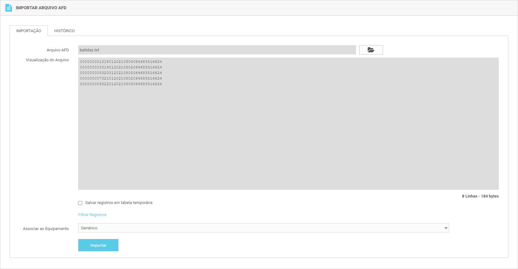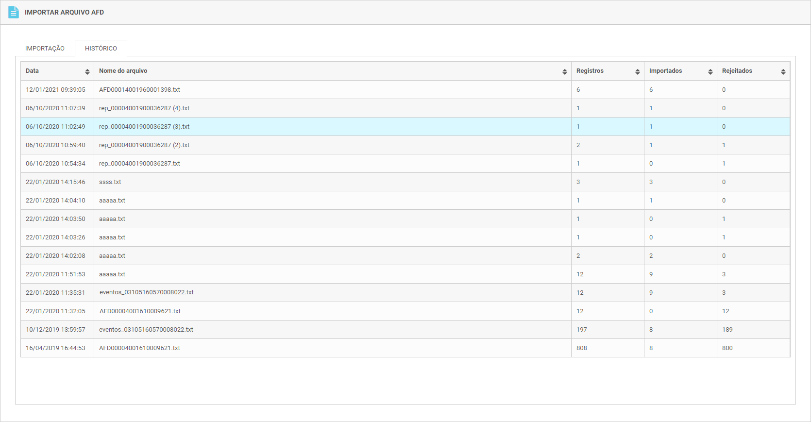 Em Histórico, vemos todo o histórico de recebimento de AFD, com informações como: Registros, Importados e Rejeitados.