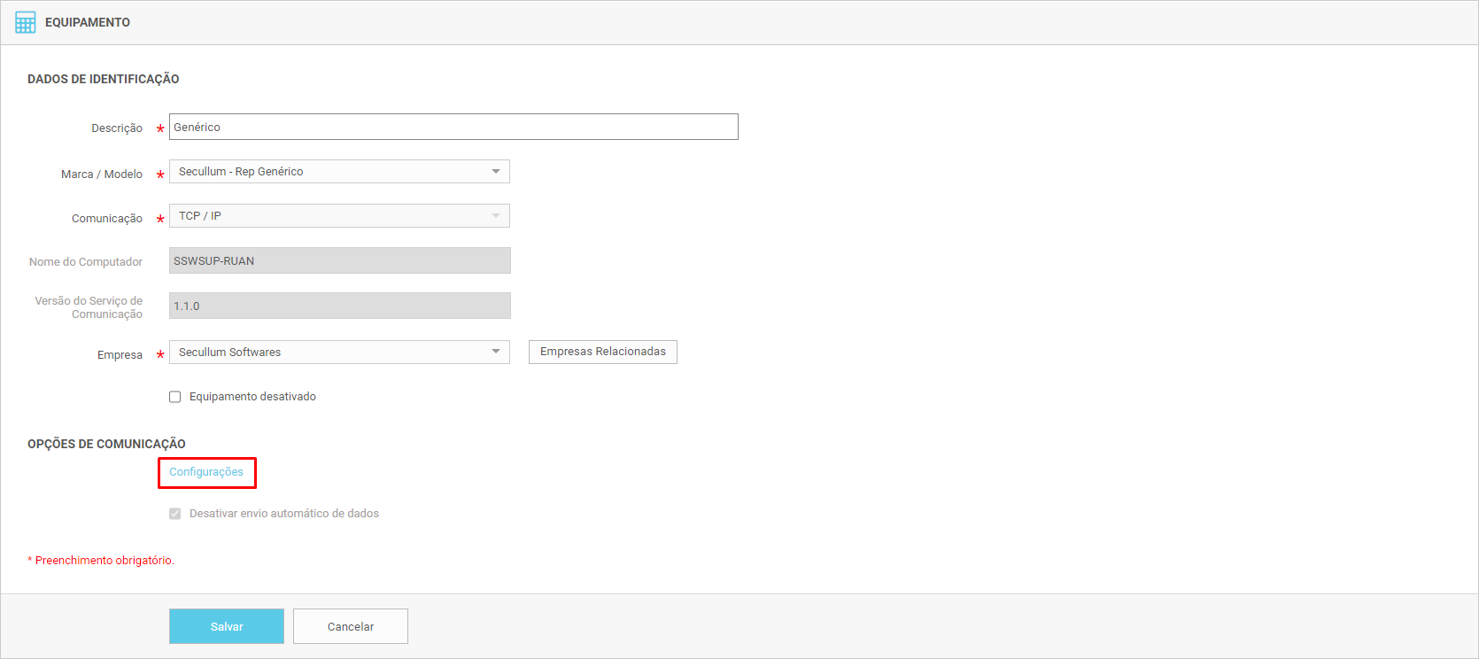 Na tela de Dados de Identificação, cadastre um equipamento com a Marca/Modelo - Secullum Rep Genérico. Depois disso, clique em Configurações: